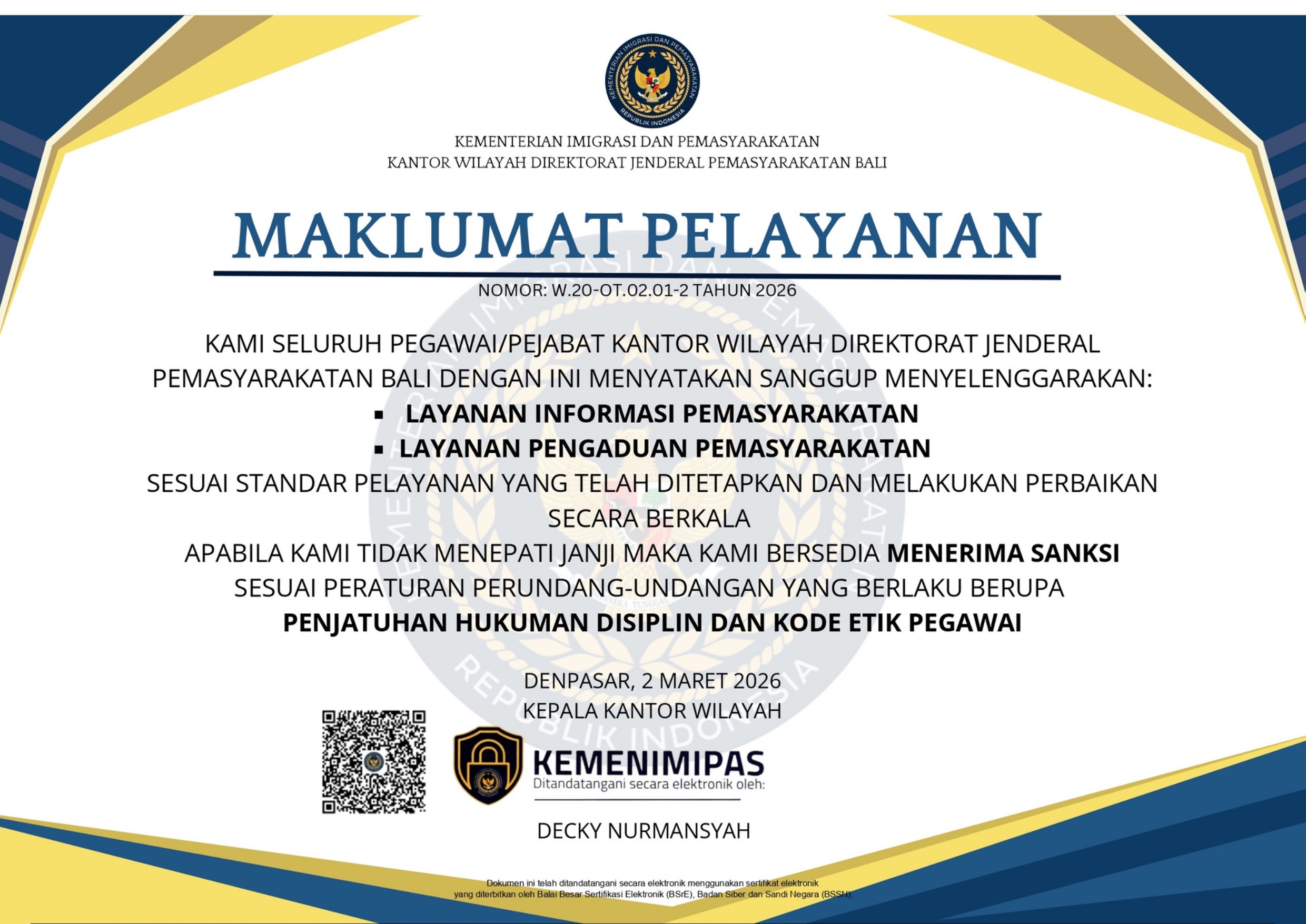 Kantor Wilayah Direktorat Jenderal Pemasyarakatan Bali bertugas mengawasi, membina, dan mengendalikan pelaksanaan sistem pemasyarakatan di Provinsi Bali. Kami berkomitmen menghadirkan pelayanan pemasyarakatan yang profesional, transparan, dan berintegritas melalui koordinasi dengan Lapas, Rutan, Bapas, dan LPKA.